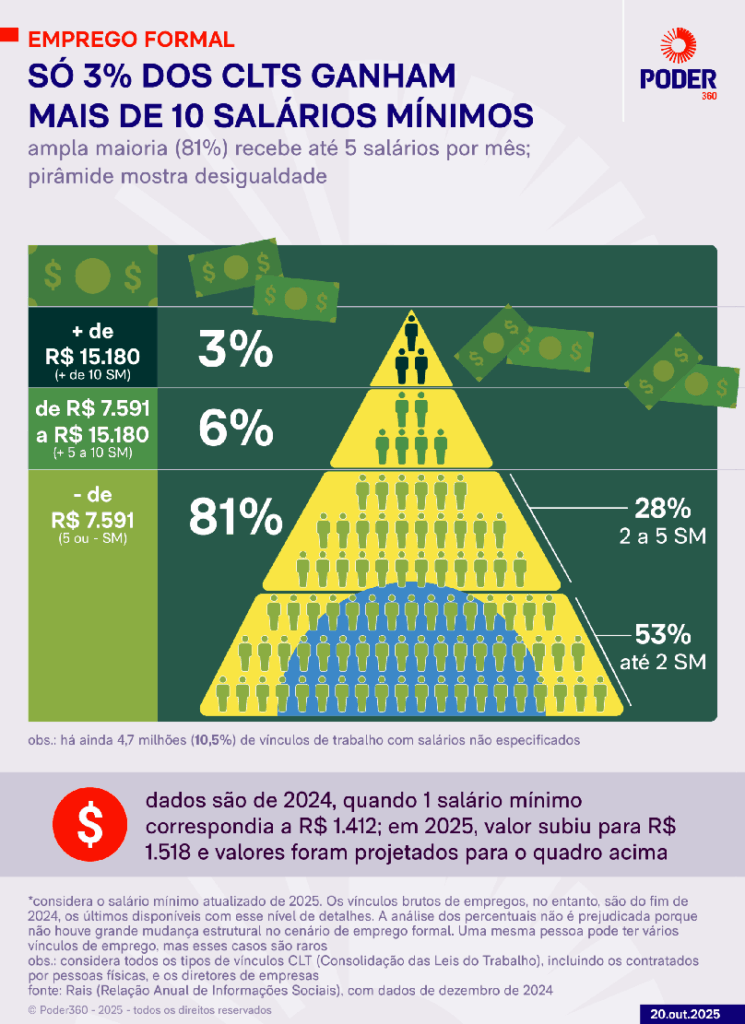 No fim de 2024, o país contabilizava aproximadamente 45,1 milhões de trabalhadores com vínculo formal, excluídos aprendizes e contratos temporários. Desse total, apenas 1,1 milhão de pessoas — o equivalente a cerca de 2,5% — tinham rendimentos superiores a dez salários mínimos mensais, o que corresponde a valores acima de R$ 15.180, considerando o piso atual.