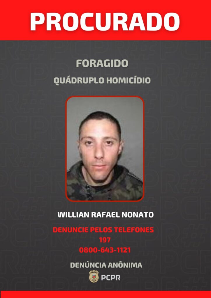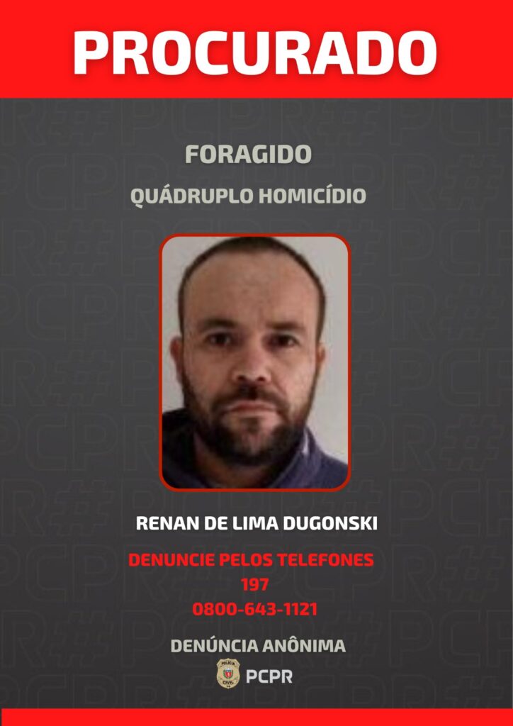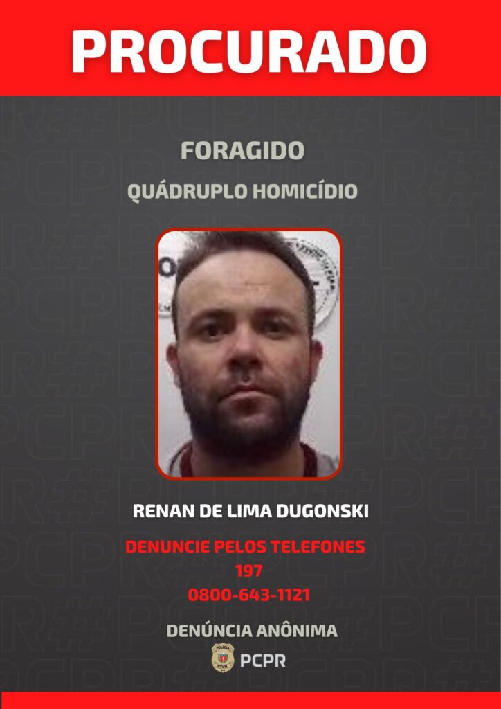 A Polícia Civil do Paraná (PCPR) divulgou, na quinta-feira (15), imagens de dois homens considerados foragidos da Justiça e investigados pela prática de quatro homicídios ocorridos no bairro Campo do Santana, em Curitiba. O crime foi registrado no dia 2 de novembro de 2025, durante a realização de uma festa de aniversário infantil.